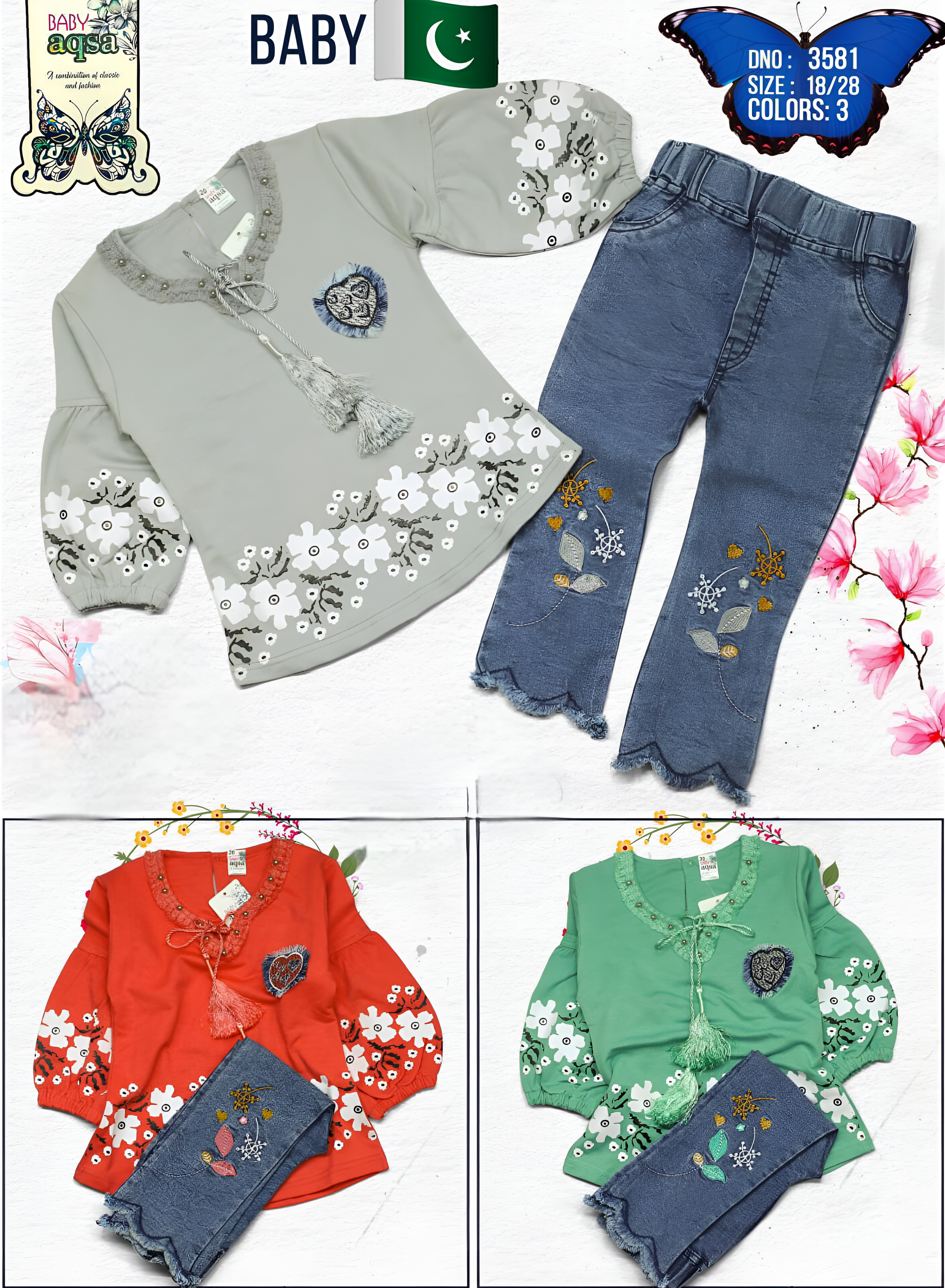 Baby Girls Floral Embroidered Top & Denim Jeans Set Soft Cotton Long Sleeve