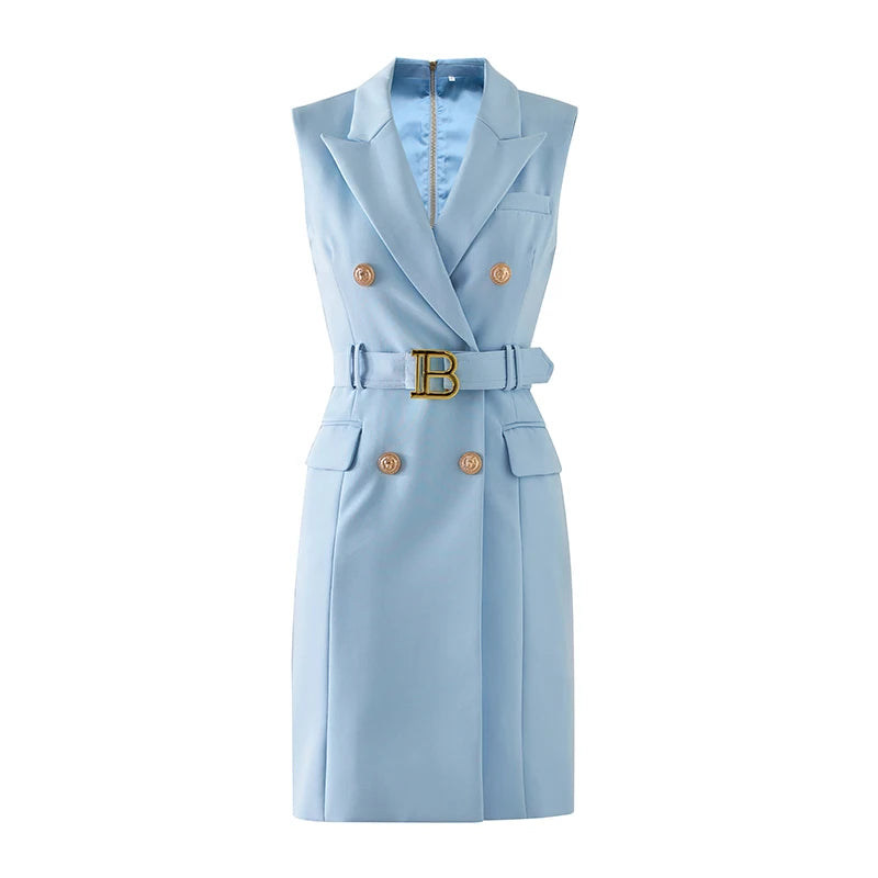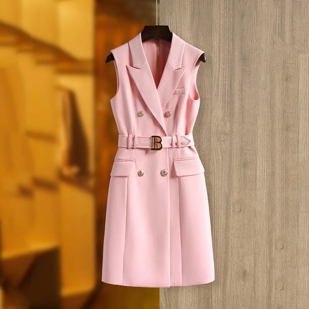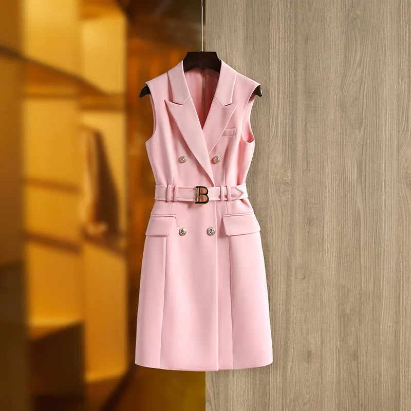 Lady Elegant Style Sleeveless Office Wear Notched Double-breasted Straight Cutting Women Solid Blazer Dress With Belt
