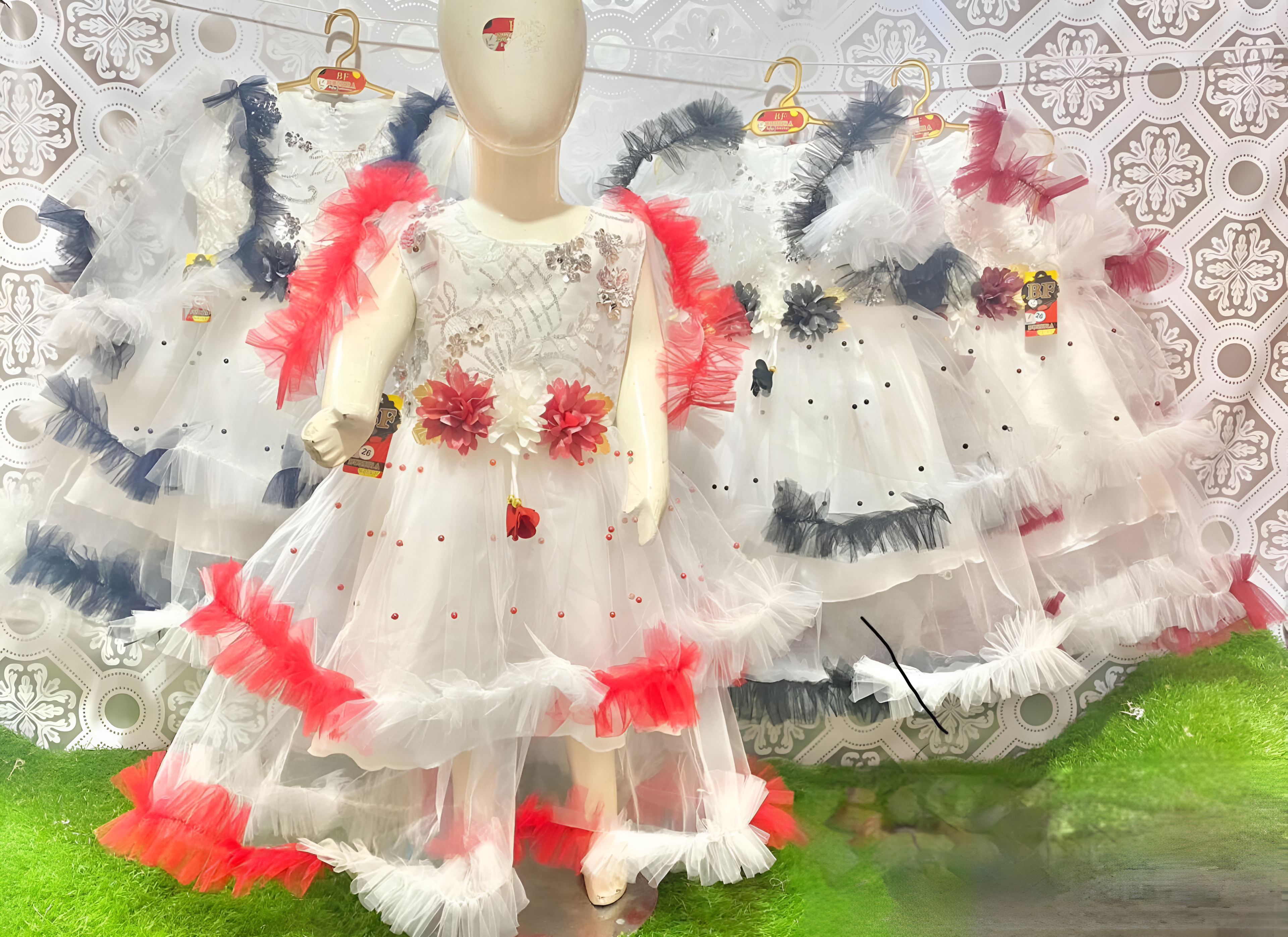 Elegant Baby Girl Party Frock – White Net Gown with Floral Embellishments & Ruffled Layers | Fancy Dress for Weddings & Birthdays (30, 32, 34)