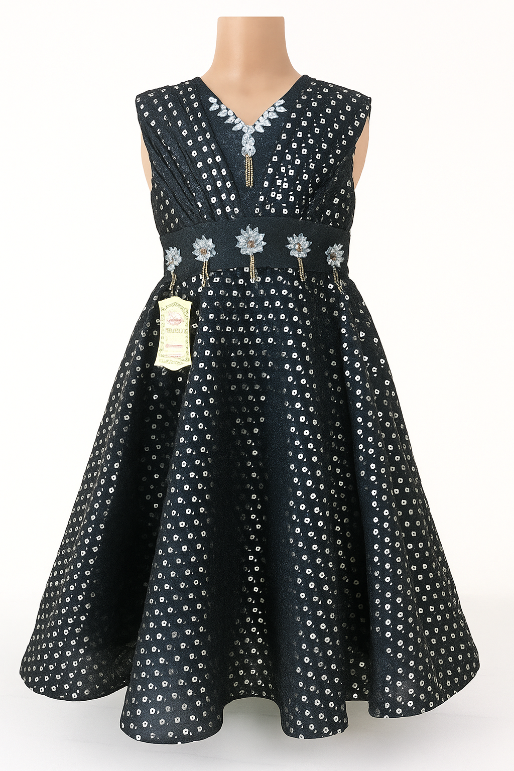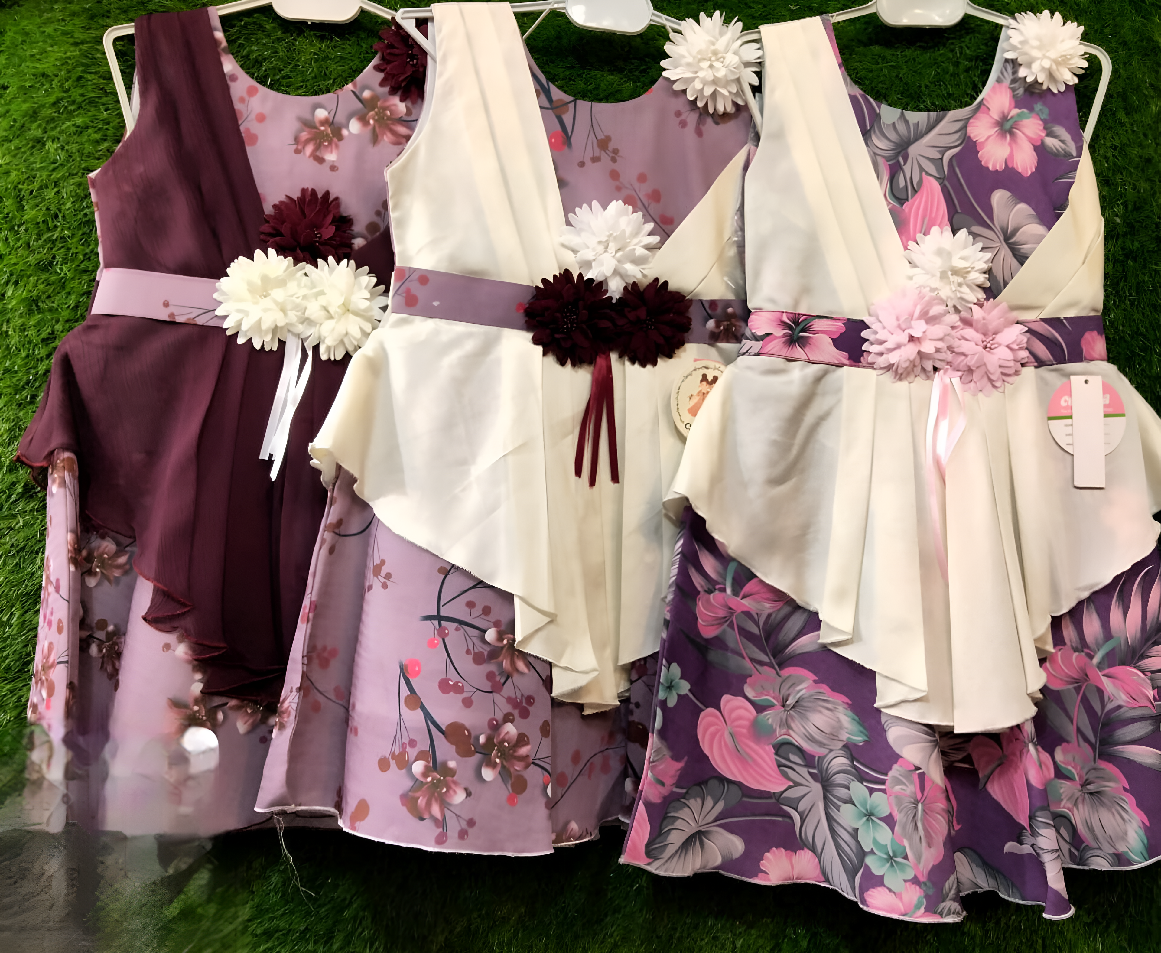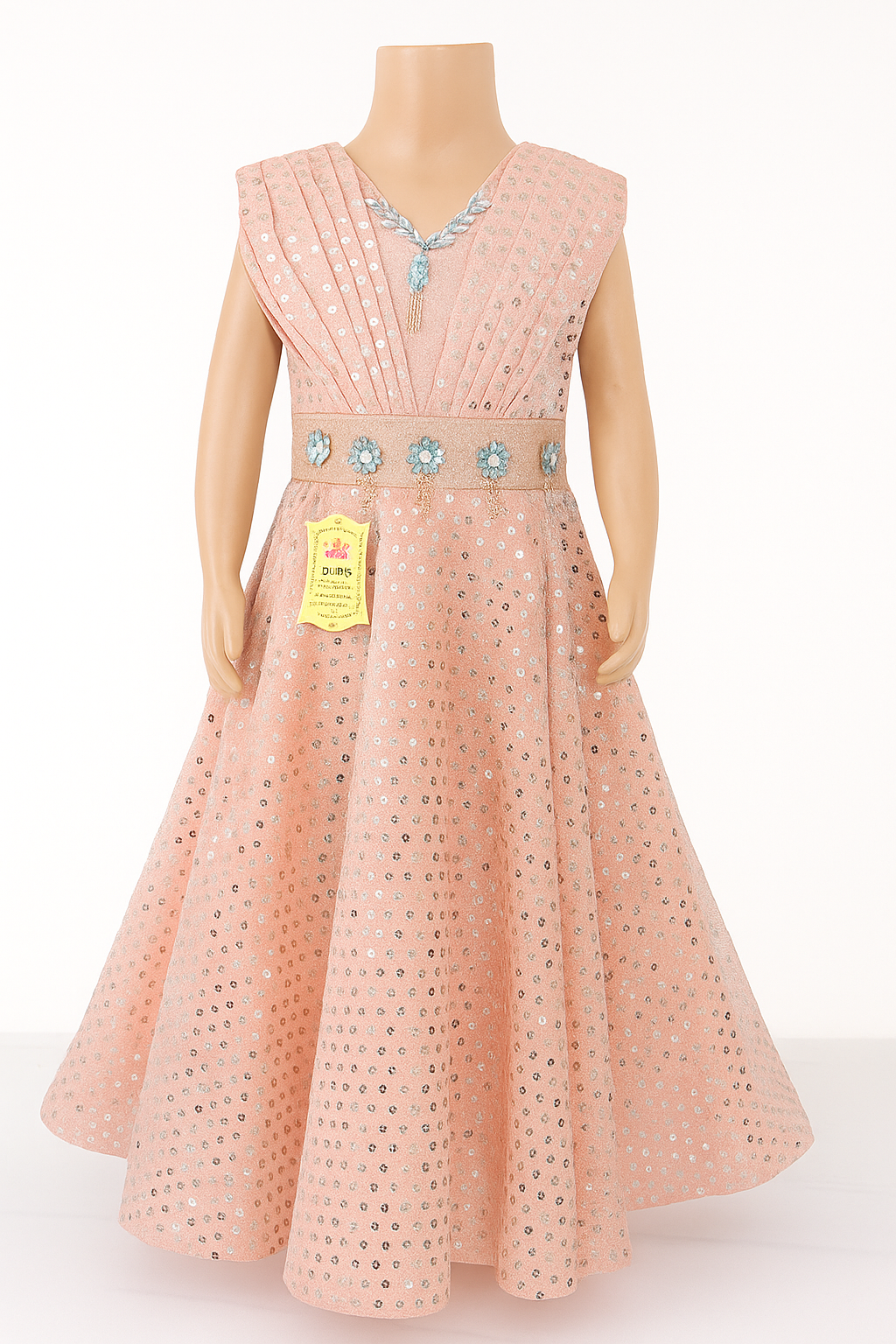 Elegant Floral Layered Frock for Girls Sleeveless Party Wear Dress with 3D Flower Belt and Draped Overlay