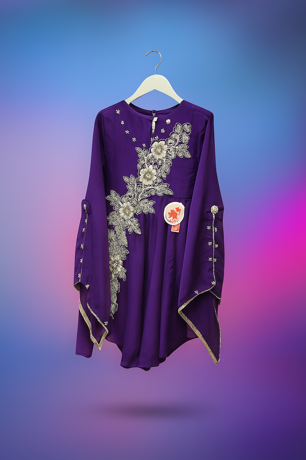 Girls Purple Embroidered Maxi Dress with Bell Sleeves Formal Party Wear for Eid & Weddings (Size 22–32)