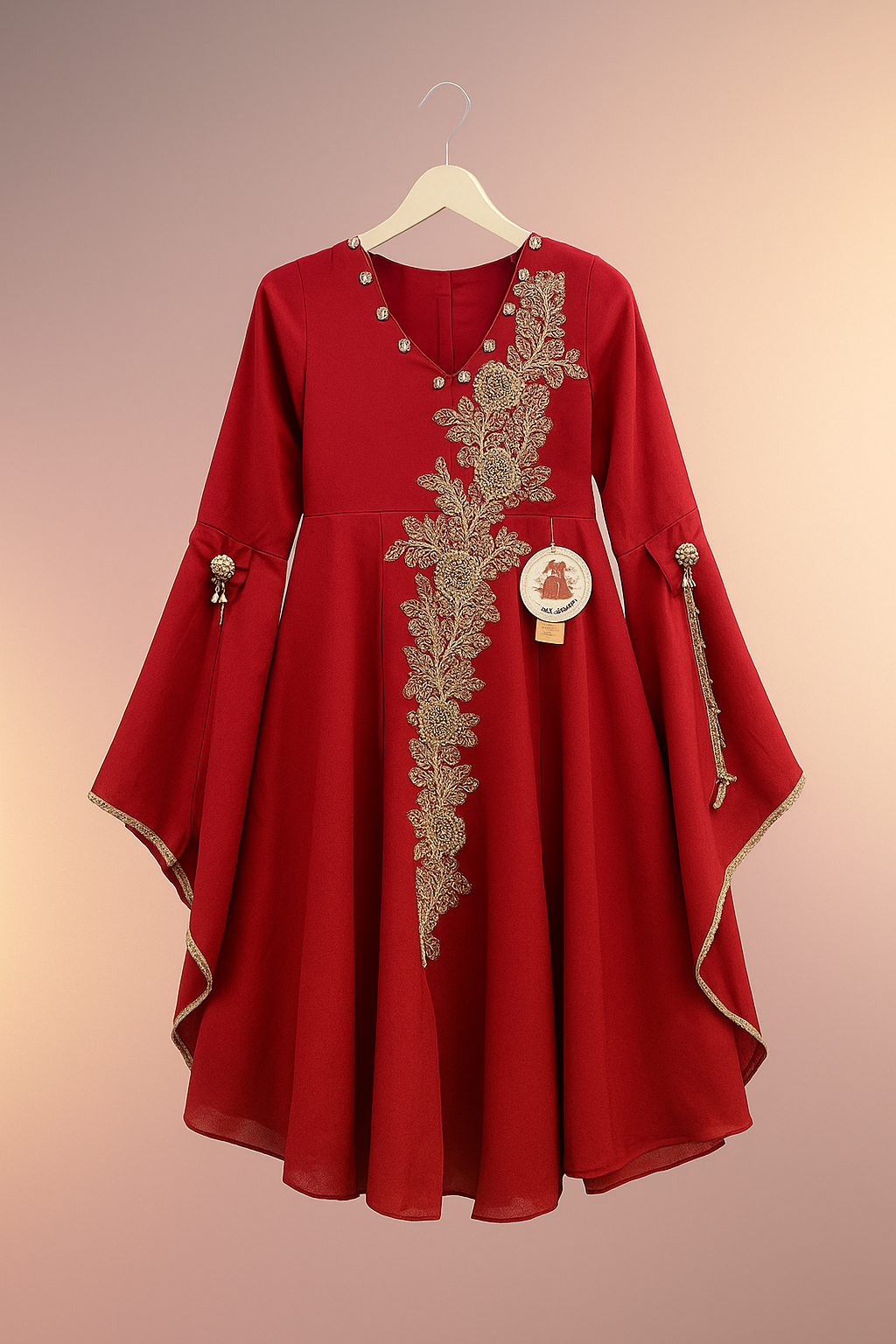 Girls Red Embroidered Maxi Dress with Bell Sleeves – Formal Party Wear for Eid & Weddings (Size 22–32)