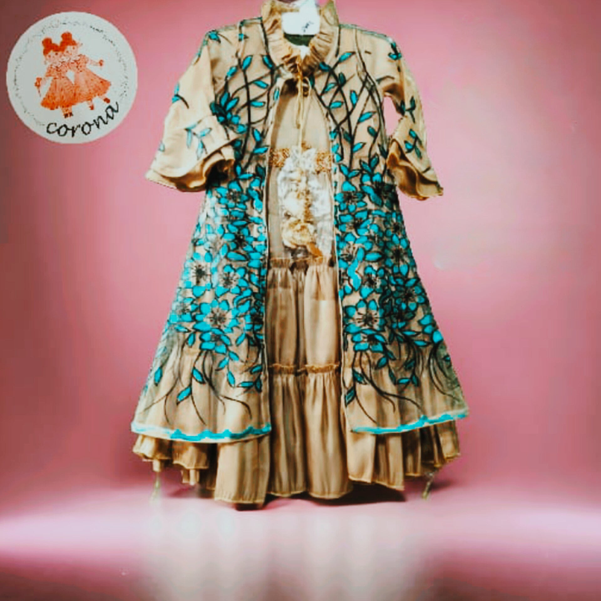 Girls Luxury Party Frock Golden Dress with Teal Floral Embroidered Net Overlay | Elegant Layered Gown | Premium Collection