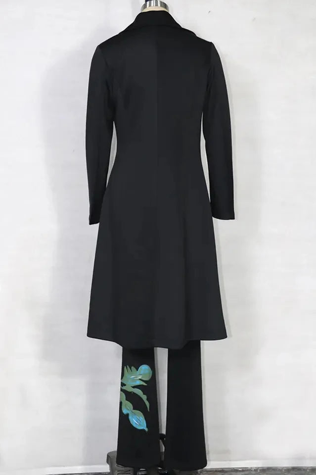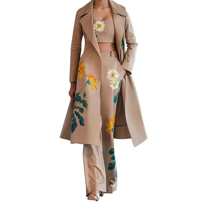 Fashion Women's Autumn Winter Floral Print Windbreaker+Chest Wrap+Pants Suit S-XL Long Coat Slim Pants Three Piece Sets