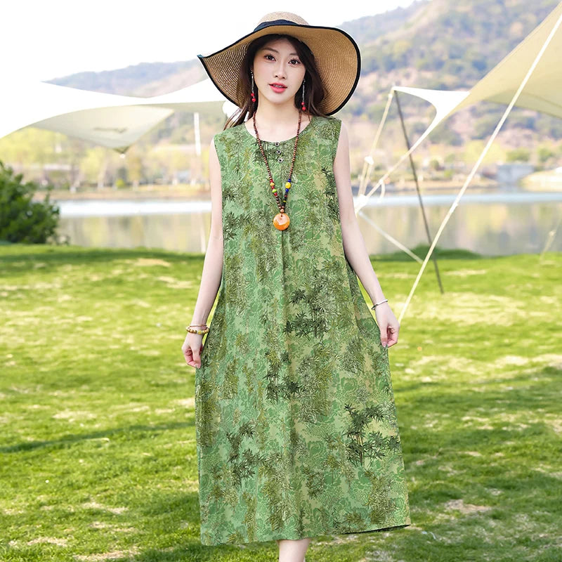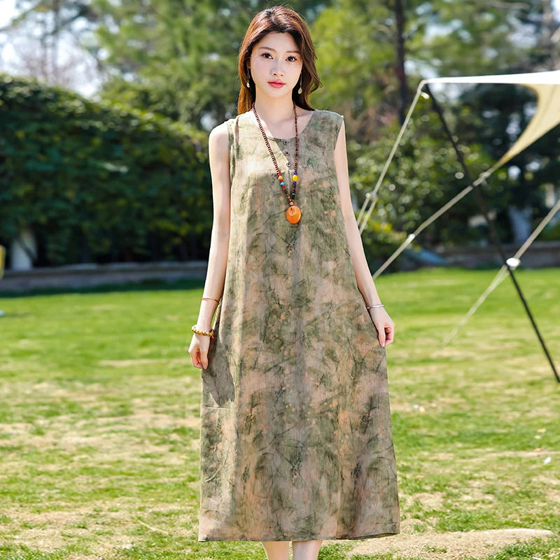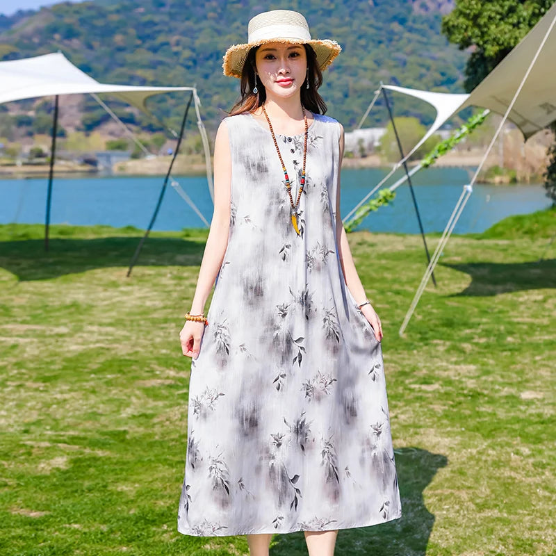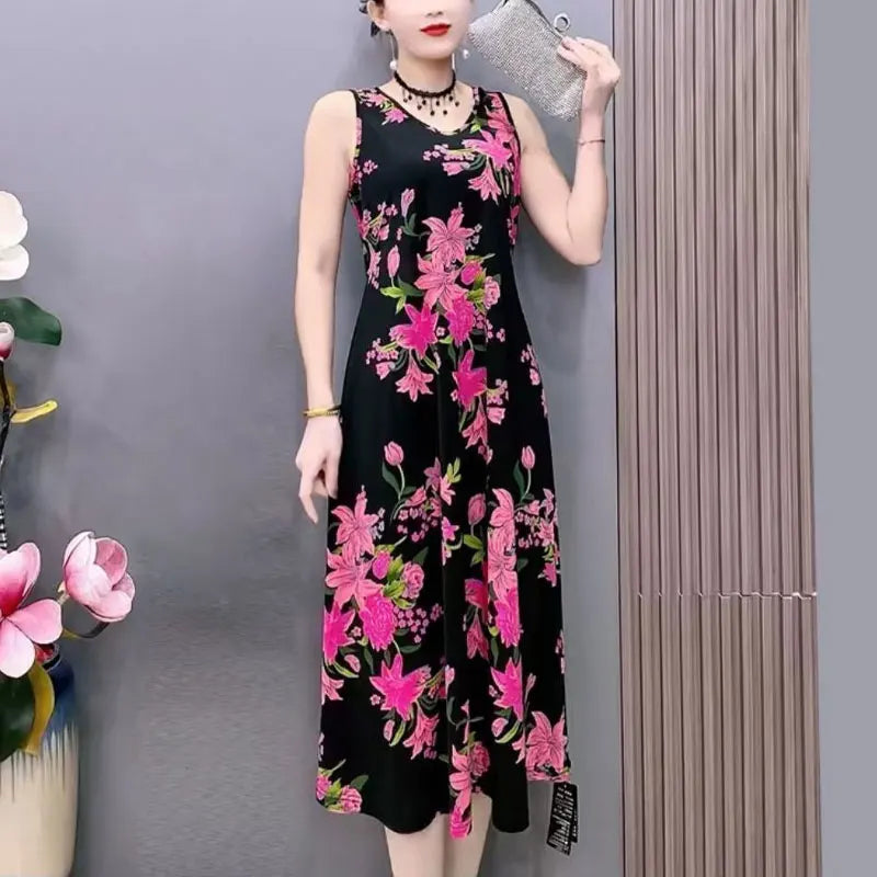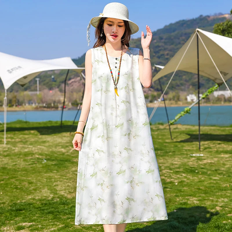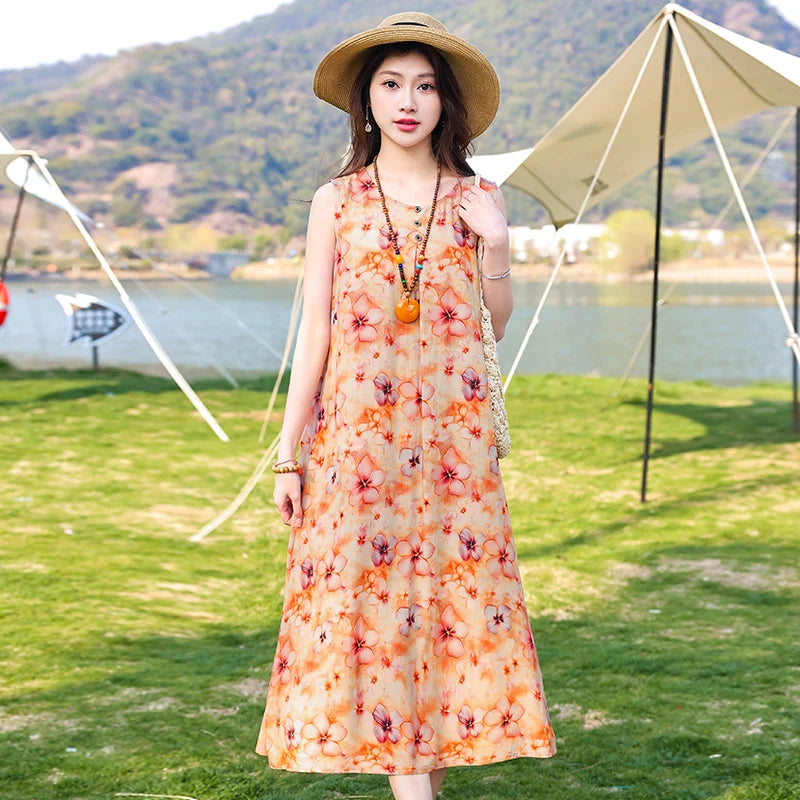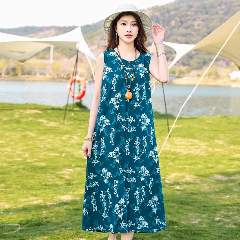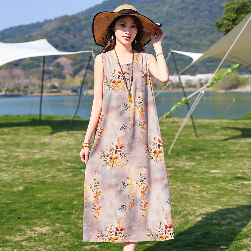 Women's Clothing Sleeveless Midi Dress Casual V-Neck A-Line Waist Summer New Vintage Broken Flowers Folk Stylish Folds Sundress