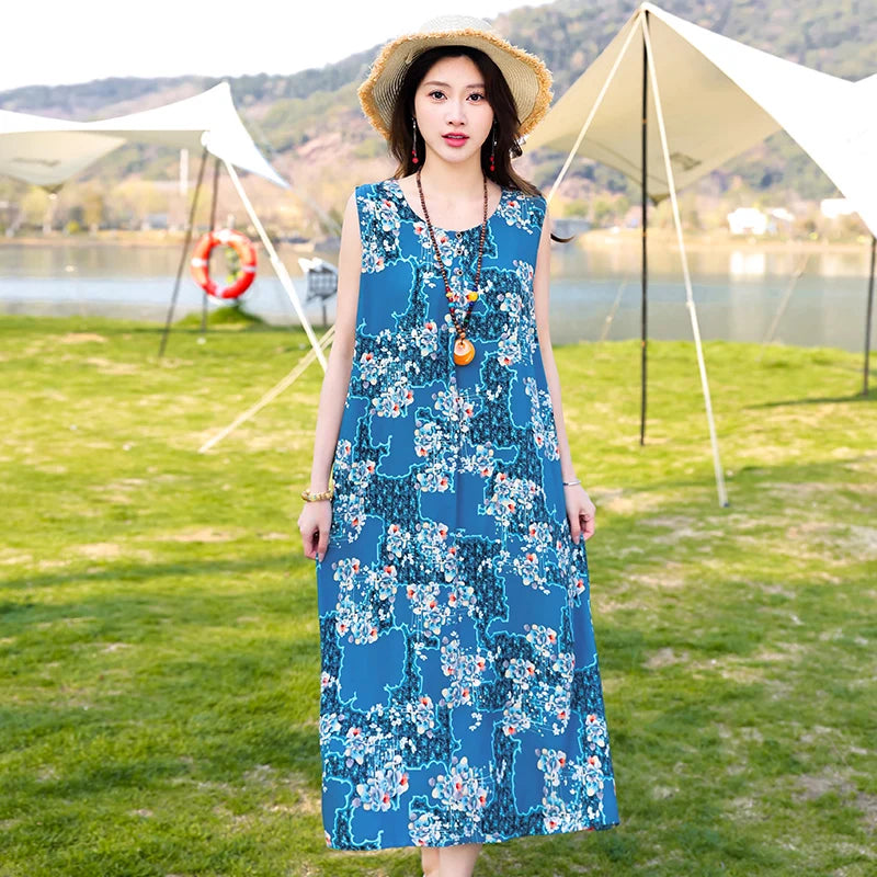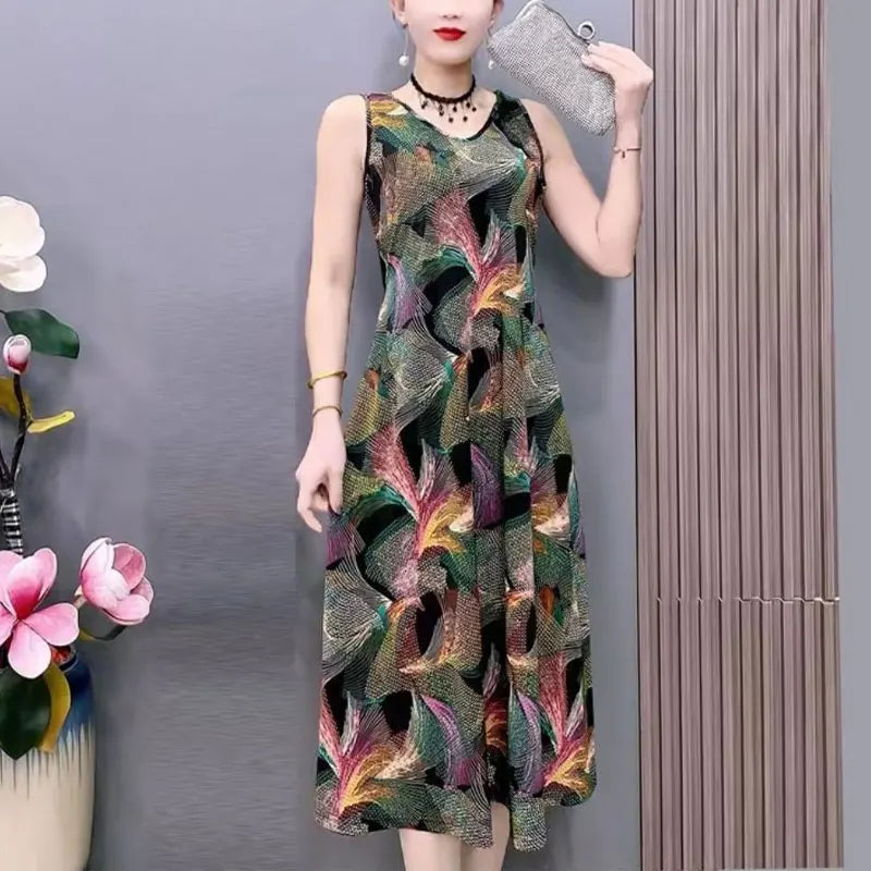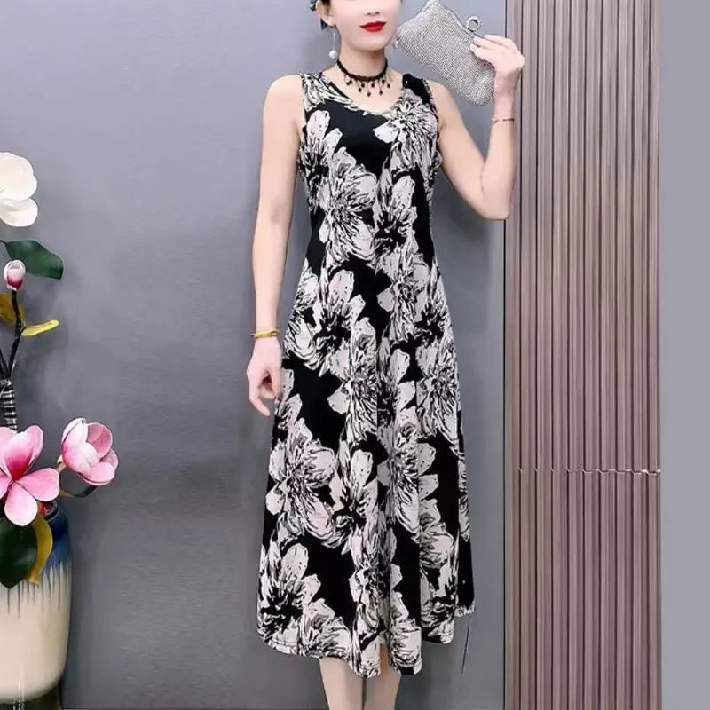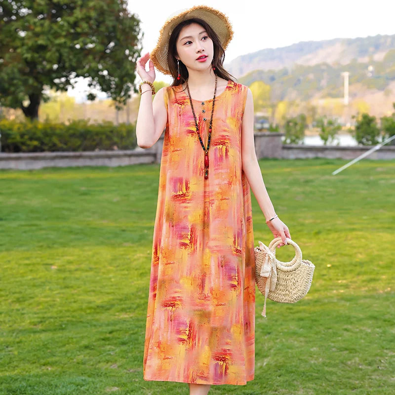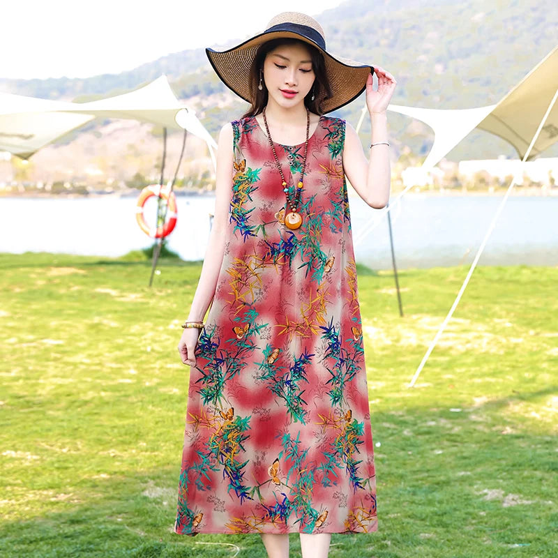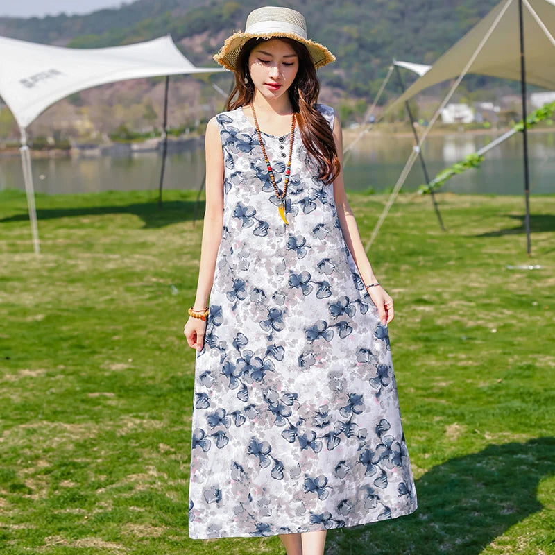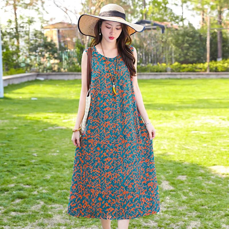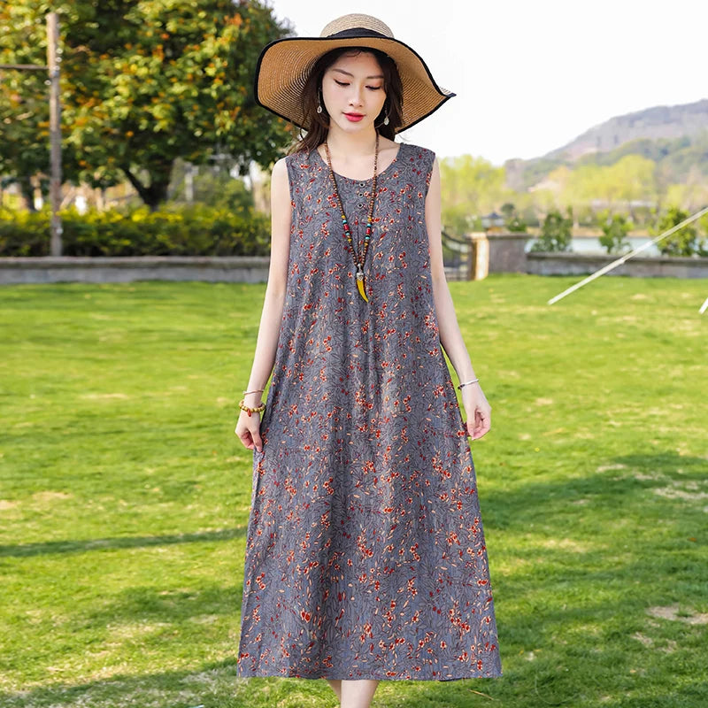 Women's Clothing Sleeveless Midi Dress Casual V-Neck A-Line Waist Summer New Vintage Broken Flowers Folk Stylish Folds Sundress