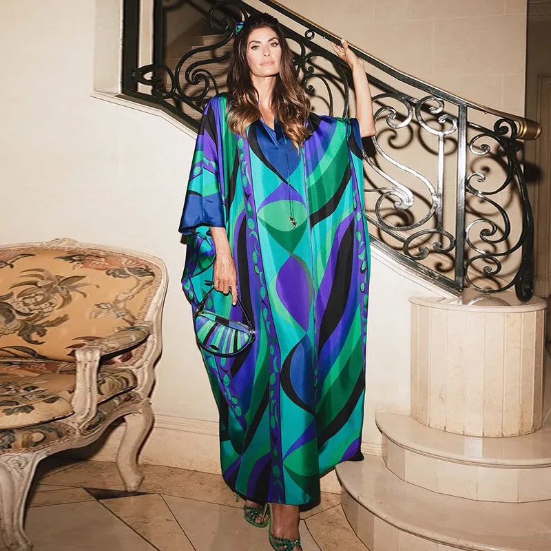 Casual Vacation Long Puff Sleeve V-neck Beach Dresses Fashion Printed Oversize Maxi Dress Women Lady Summer Bohemia Party Robes