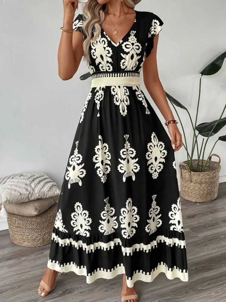 Women Elegant V Neck Short Sleeves Dresses Geometric Pattern Vacation Style Floral Print Dress Beach Sundress Size S-XXL