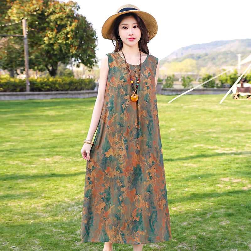 Women's sleeveless V-neck floor-length dress with abstract prints - fashionable for beach and casual occasions