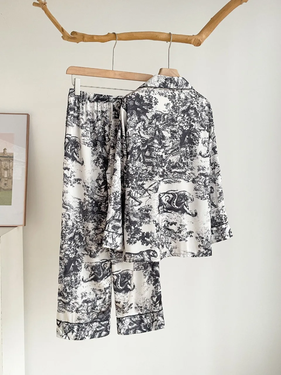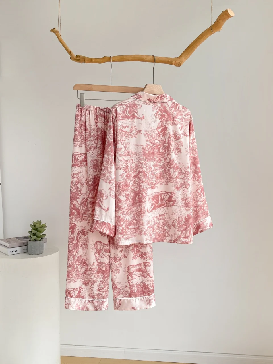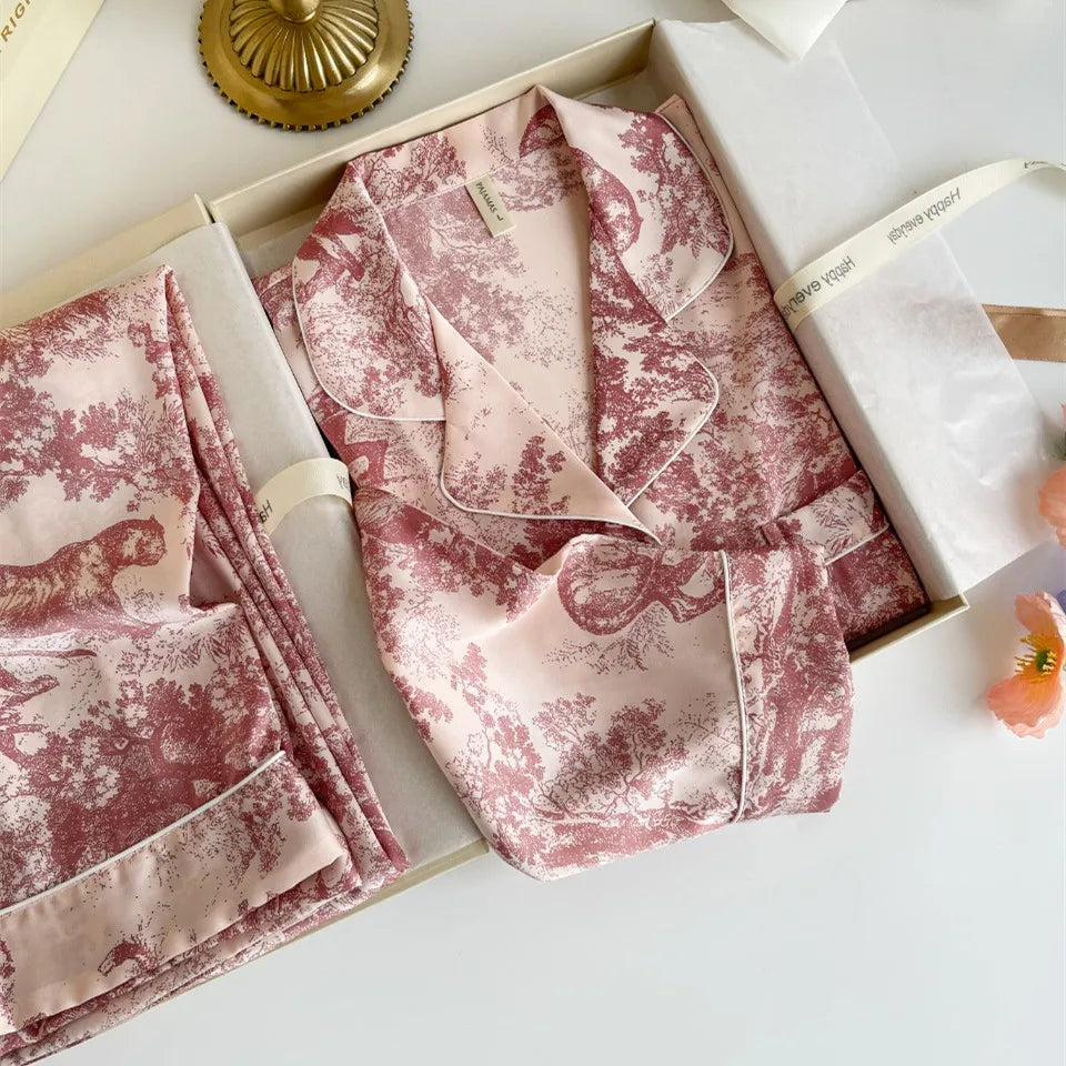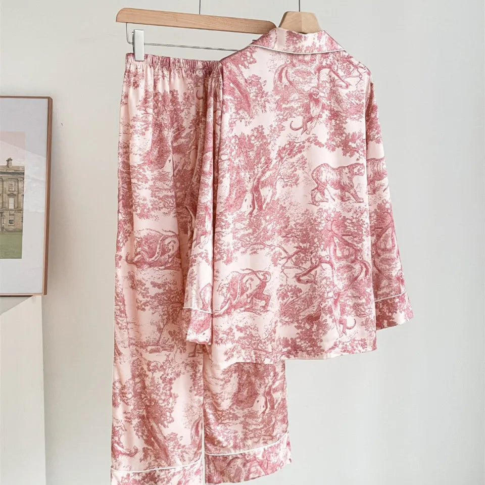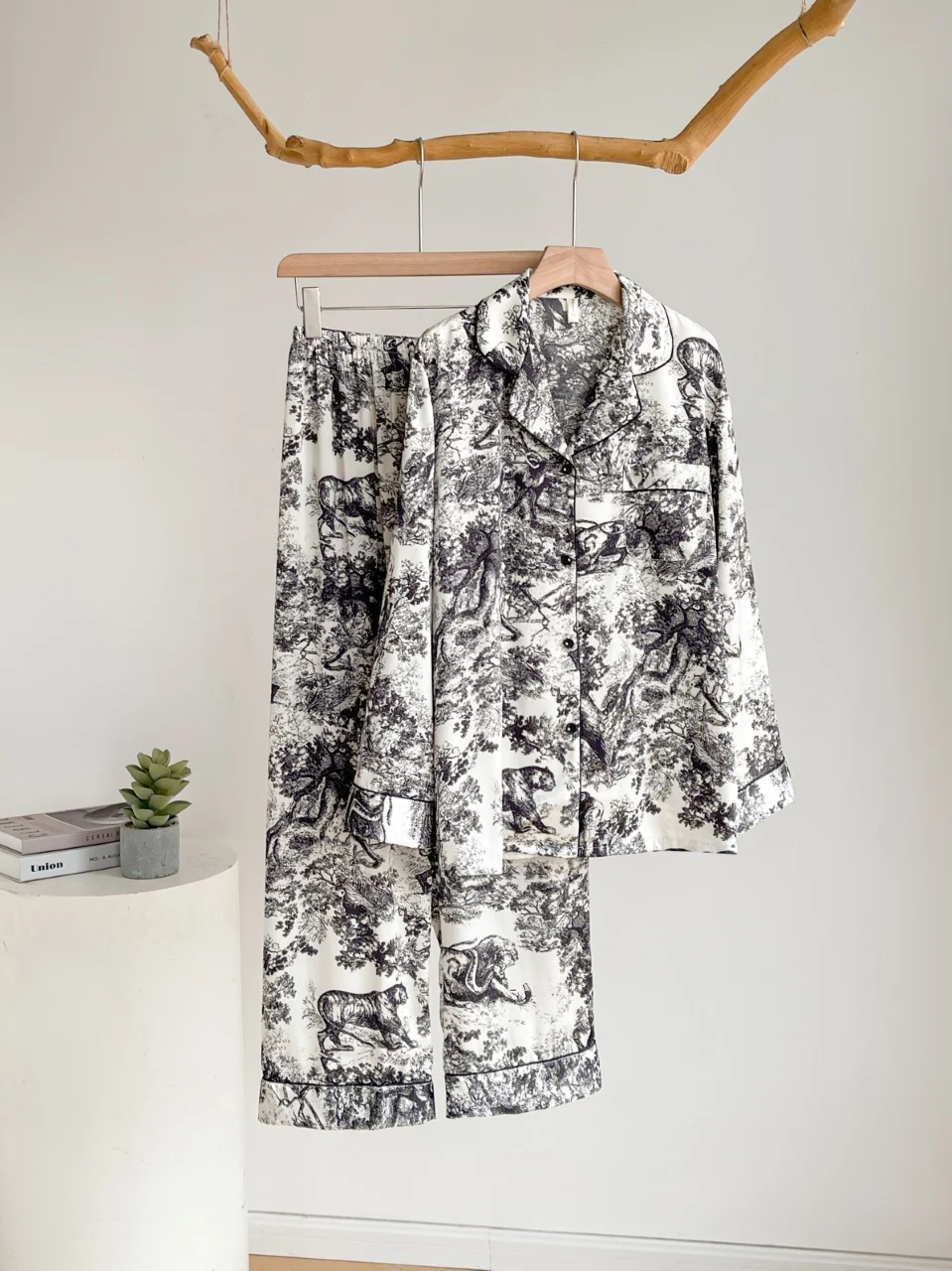 2024 New Design Silk Ladies Pajamas Autumn Elegant Jungle Print Women's Plus Size Sleepwear Long Sleeve Trousers Home Wear Set