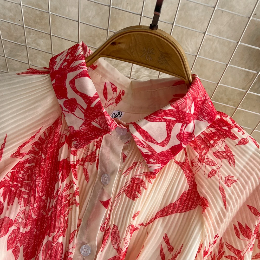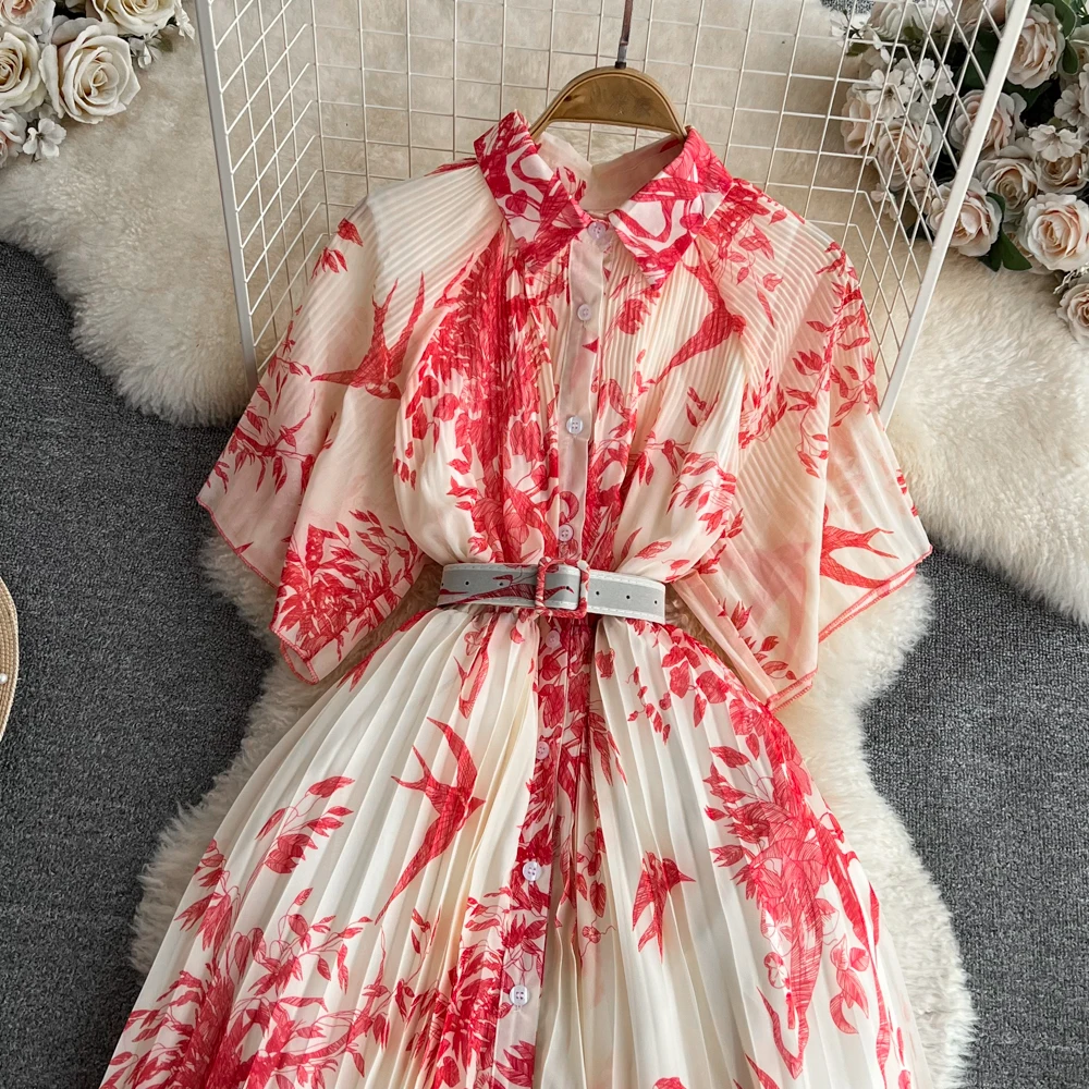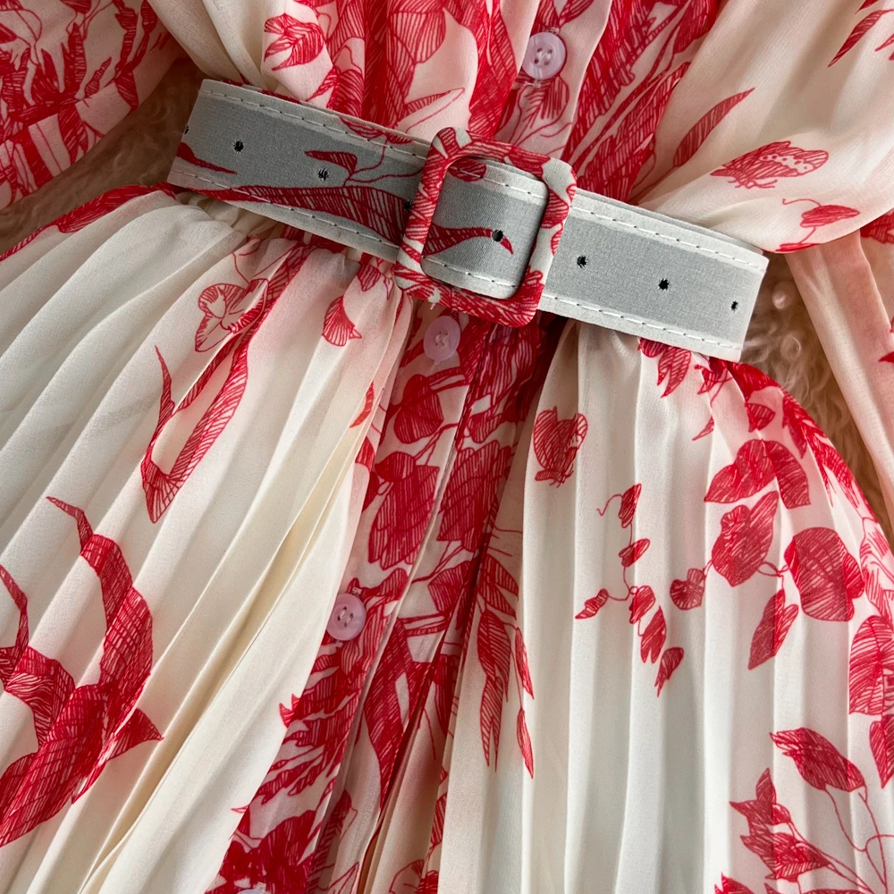 Pleated Casual Dresses Retro Short Sleeves a Line Single Breasted Waist Belt Dress Celebrity Flower Printing Women Clothes