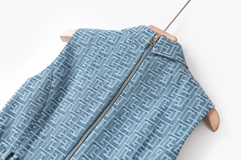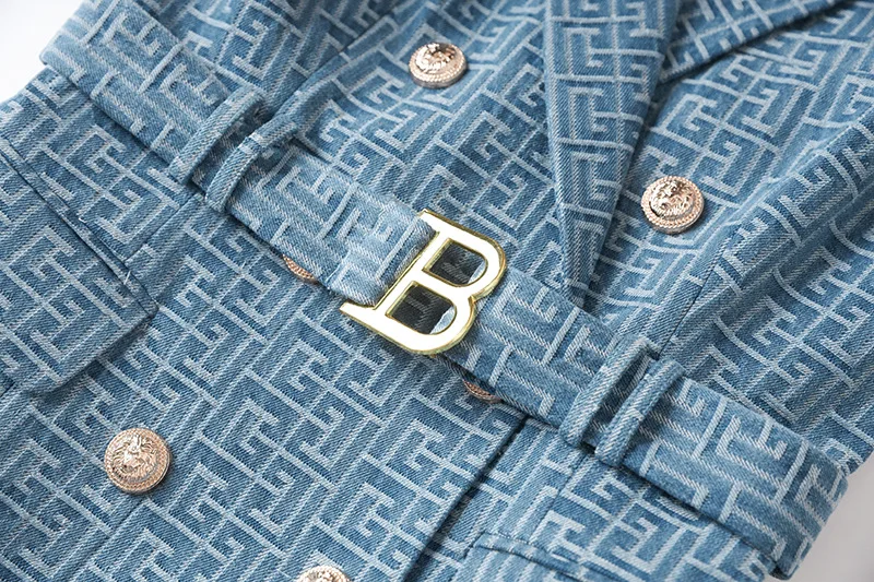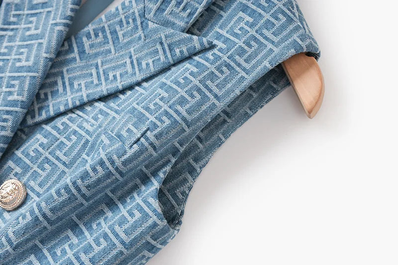 Summer Vintage Style Geometric Pattern Lady Notched Sleeveless Cloth Women Slim Office Double-breasted Blazer Dress With Belt
